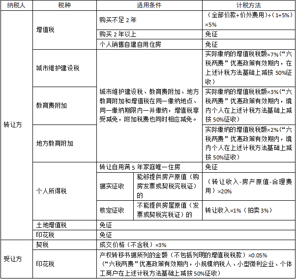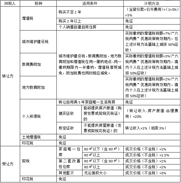 个人转让存量(二手)住房业务税率表