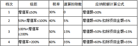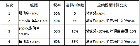 【附注】土地增值税增值额=房地产转让收入-扣除项目金额,增值率=增值额/扣除项目金额×100%,根据增值率确定适用税率,税率表如下: