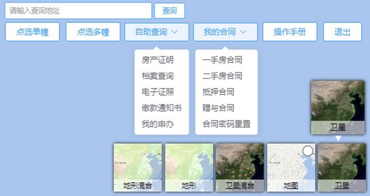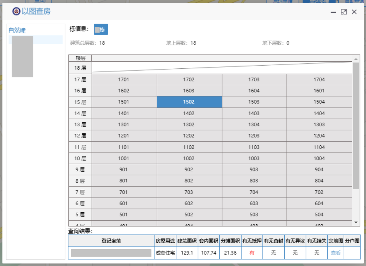 3.可视化查询(以图查房):适用于任意人查询,通过地名地址快速定位查询的不动产位置,叠加天地图的电子地图、影像地图等,可查看房屋周边情况,点击自然栋图形,即可查看楼盘名称、地址、房屋用途、建筑面积、房屋坐落、抵押查封产权状态等楼盘表信息及对应房屋信息。