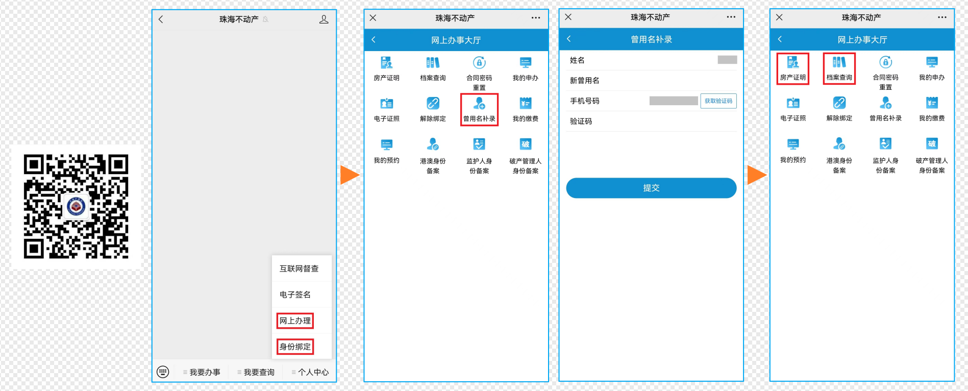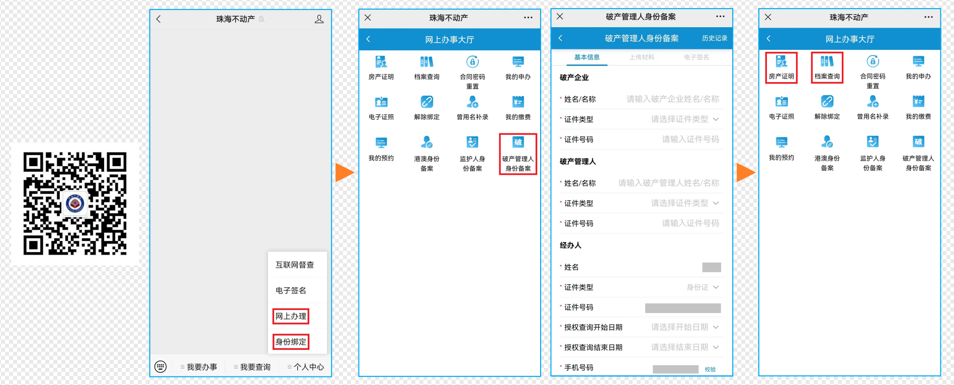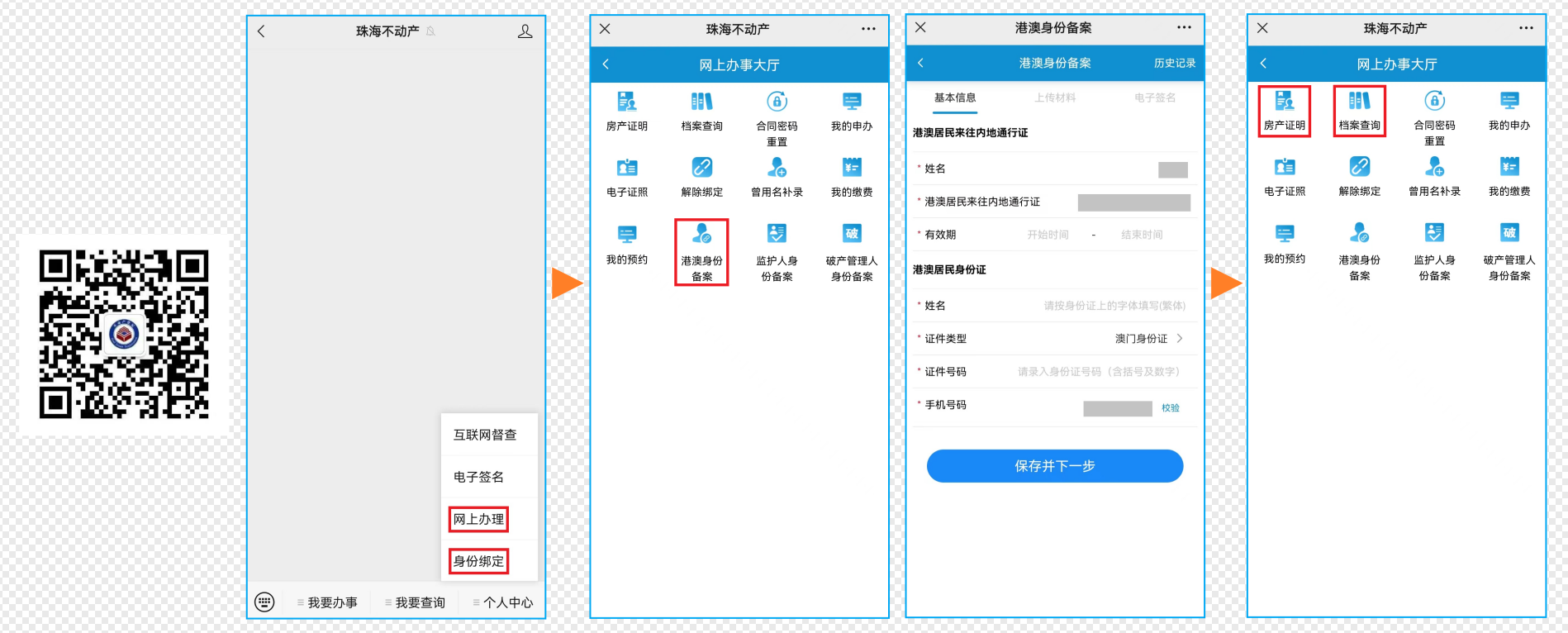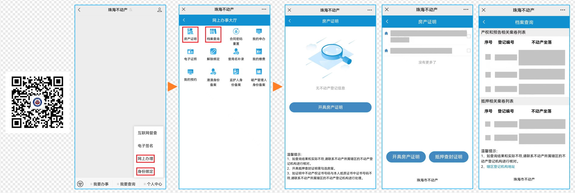 1.特定身份查询:微信关注“珠海不动产”公众号,在“个人中心”进行“身份绑定”后,点击“网上办理”,即可查询、打印个人名下的不动产产权、抵押查封证明及合同、发票、税单等档案信息。