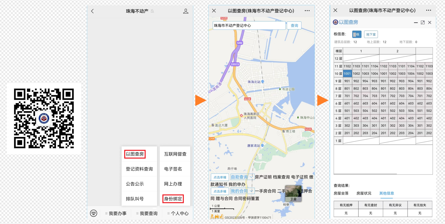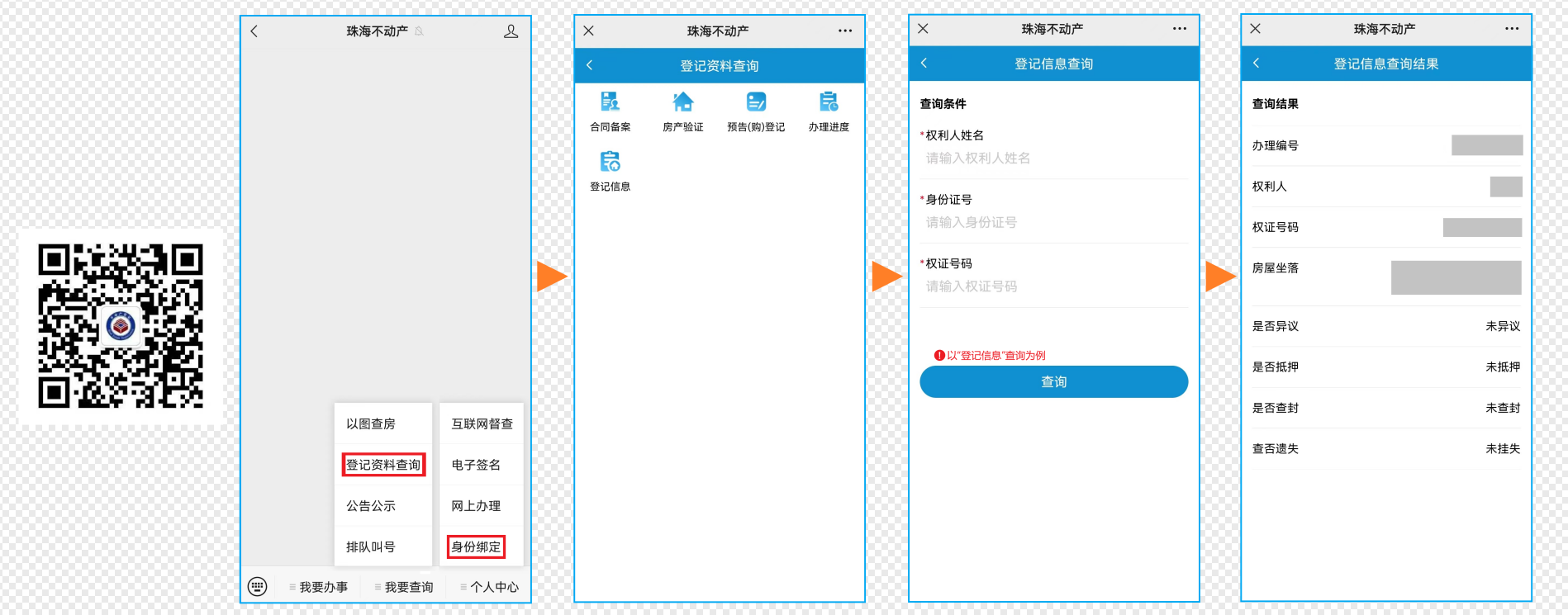 2.任意人公开查询:微信关注“珠海不动产”公众号,在“个人中心”进行“身份绑定”后,在“我要查询”栏点击“登记资料查询”,根据提示输入相关信息即可查询业务办理进度、合同备案情况、预告(购)登记情况、产权及抵押限制情况等信息。