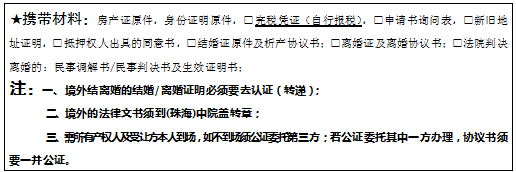 (1)、全流程网上办理(需无抵押无贷款,登记和税务一并申办,无需到现场):在“珠海不动产”微信公众号进行身份认证,点击“办事大厅”—“在线申请”—“转移登记”—申办事项婚内析产选择“共有房地产权变更登记”,离婚析产选择“房地产权离婚析产转移登记”,按要求填写交税和过户申请,上传申请材料,电子签名,缴纳税费完成登簿后线上缴纳登记费。选择电子证书的可在“办事大厅”—“电子证照”领取,选择纸质证书且填写邮寄信息的直接邮寄送证。
