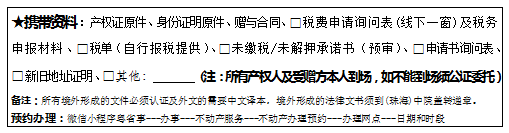 5、先税后证(自行报税):签订赠与合同—在微信小程序“粤税通”或“税务窗口”报税—完税后打印纸质税单—带齐资料到登记中心办理转移登记。