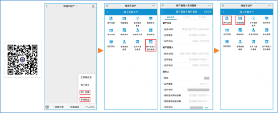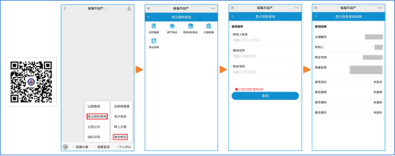 2.任意人公开查询:微信关注“珠海不动产”公众号,在“个人中心”进行“身份绑定”后,在“办事大厅”-“我要查询”栏点击“登记资料查询”,根据提示输入相关信息即可查询业务办理进度、合同备案情况、预告(购)登记情况、产权及抵押限制情况等信息。