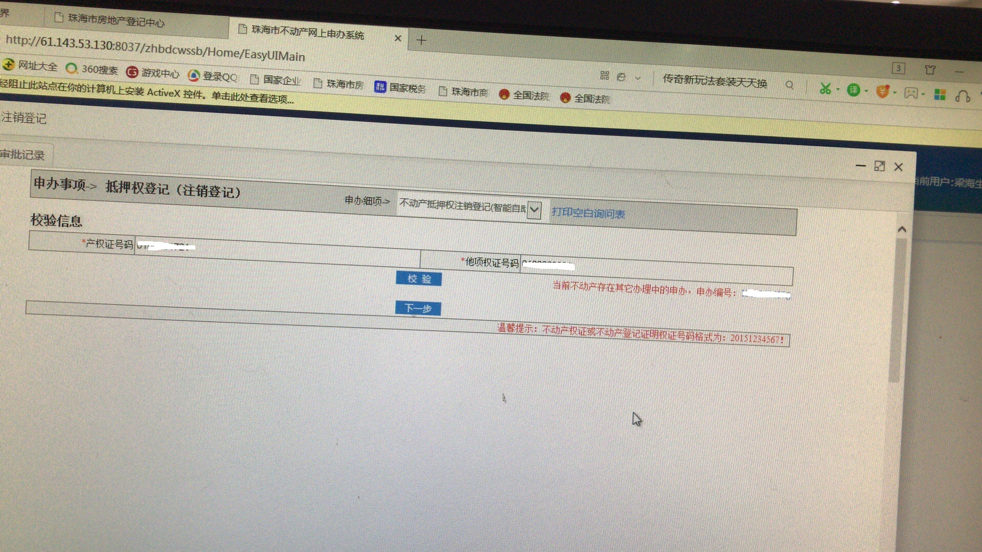 目录 搜索 作废申办报错校验时提示存在其他申办 暂无相关搜索结果! 本文档使用 MinDoc 发布 校验时提示存在其他申办 在金融部门网上申办系统进行申办时,点击校验提示“当前不动产存在其它申办中的申办,申办编号xxxxxxxxxx” 如图所示:解决办法:作废后重新申办打开珠海市不动产登记中心官网首页,点击网上申办-申办修改,输入申办编号,申办人名称,查询出来后点击撤销、作废,文档更新时间: 2020-09-02 10:47 作者:江梦玲
