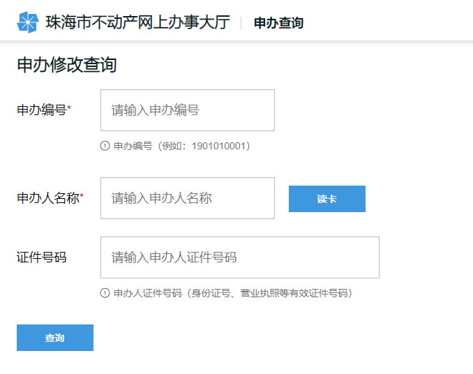 1、怎么查询中心审批进度? 1、打开“珠海不动产登记中心”网址,点击网上申办; 2、再点击申办修改; 3、在申办修改查询页面输入申办编号和申办人姓名,点击查询即可。 文档更新时间: 2020-09-29 09:46 作者:AMQ