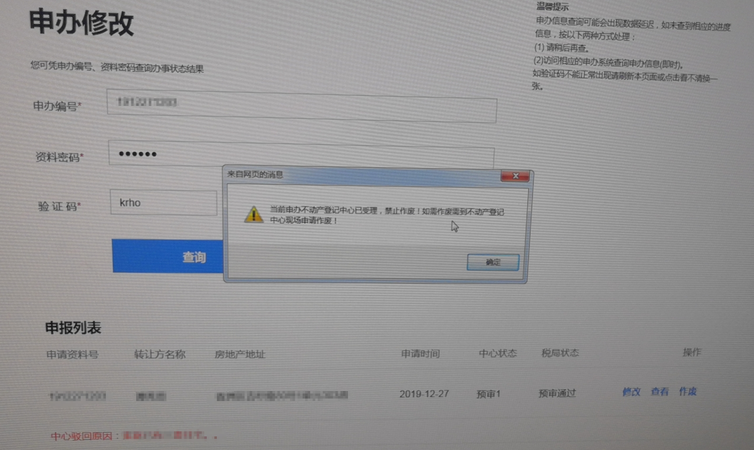 目录 搜索 一窗受理网址申办作废查询审批进度预约查询问题一窗网站进不去房产交易校验失败其他 暂无相关搜索结果! 本文档使用 MinDoc 发布 申办作废 一窗受理如果需要作废申办 在不动产登记中心已受理了这单申办的情况下,如果想要作废,需要买卖双方到不动产的7号窗口申请退件,然后在申办修改作废,或者买卖双方关注“珠海不动产”公众号,按要求实名认证后,在我的申办进行作废,然后在申办修改作废。文档更新时间: 2020-09-30 09:17 作者:AMQ