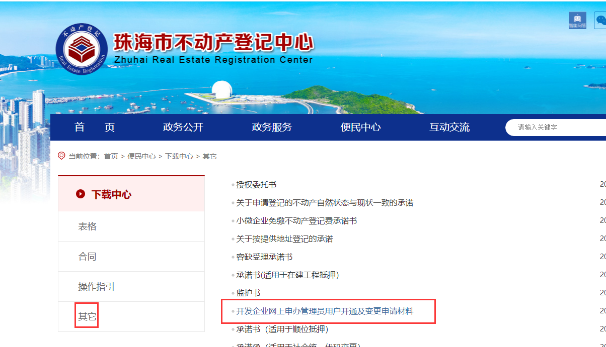2、没有开发企业管理员的企业可按照登记中心官网的要求提交资料申请,珠海市不动产登记中心官网首页—便民中心—下载中心—其他—开发企业网上申办管理员用户开通及变更申请材料,申请资料请使用官网提供的模板。开发企业管理员可以给所在企业的所有用户配置权限、绑定数据及添加、删除账号。