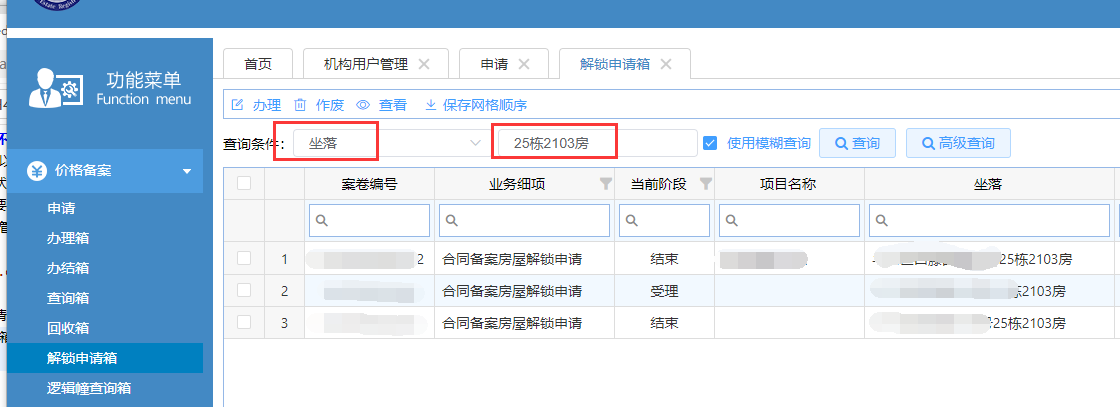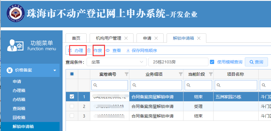 解决方法:去解锁申请箱选择对应的查询条件,并录入对应的查询内容进行检索,查出来后点办理继续操作或者作废重新提取。例如选择坐落进行检索,录入具体的栋号房号选择模糊查询后点查询。注意:栋号和房号之前有单元号的也要录入!