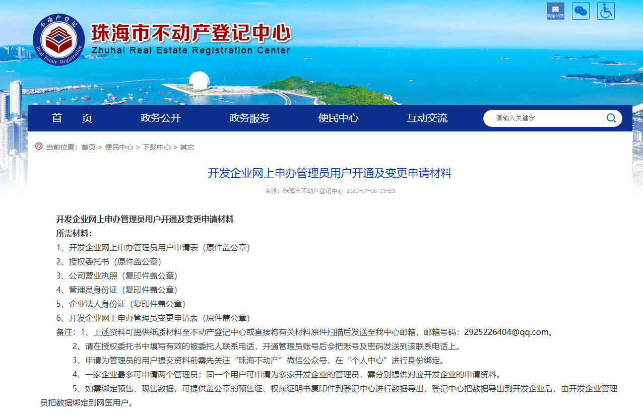 打开珠海市不动产登记中心官网首页,点击便民中心——下载中心——其他——开发企业网上申办管理员用户开通及变更申请材料。