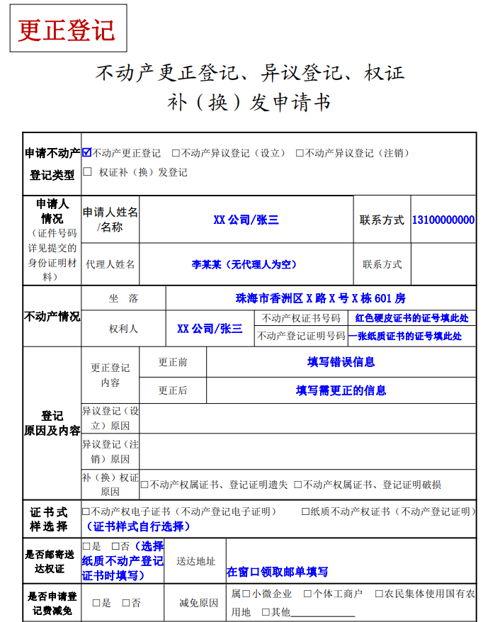 目录 搜索 申请书填写范例夫妻财产分配协议书申请书填写范例---产权注销申请书填写范例---抵押权设立申请书填写范例---抵押权注销申请书填写范例---二手房转移或者赠与申请书填写范例---夫妻婚内析产申请书填写范例---更正登记申请书填写范例---名称或者地址变更申请书填写范例---遗失补发赠与合同 暂无相关搜索结果! 本文档使用 MinDoc 发布 申请书填写范例---更正登记 文档更新时间: 2025-03-13 11:50 作者:珠海市不动产登记中心